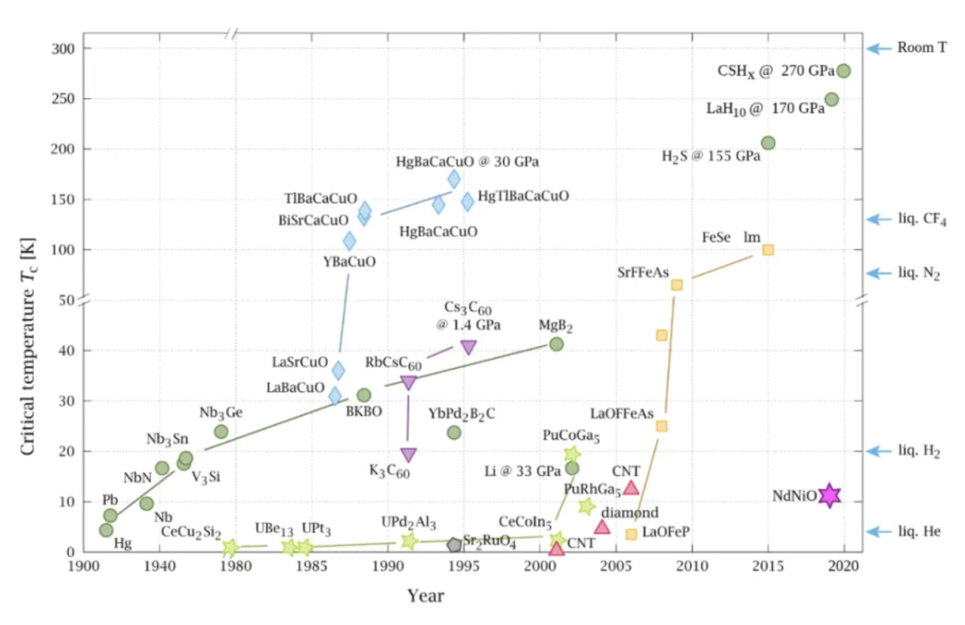 嚴(yán)格意義上講,超導(dǎo)體并非是一種新物質(zhì)。早在1911年,荷蘭物理學(xué)家海克·卡末林就發(fā)現(xiàn)了汞的超導(dǎo)現(xiàn)象。他在實驗中發(fā)現(xiàn),當(dāng)汞的溫度降至-268.9°C(4.2K)以下時,電阻突然消失。隨后在德國物理學(xué)家威廉·邁登和羅伯特·奧肯、約翰·巴丁和約翰·巴丁、蘇聯(lián)物理學(xué)家康斯坦丁·亞歷山大羅維奇·穆拉延斯基、康斯坦丁·穆拉延斯基和亞歷山大·奧格爾尼科夫、日本科學(xué)家鈴木義人等眾多科學(xué)家和科研團(tuán)隊先后發(fā)現(xiàn)了鉛、鉭、氧化銫釔鋇銅氧、氧化鐠鋇銅氧、氧化鑭鋇銅氧等物質(zhì)的超導(dǎo)特性。然而遺憾的是,這些超導(dǎo)特性的成立均需遠(yuǎn)超自然的特定環(huán)境。比如氧化銫釔鋇銅氧的超導(dǎo)性要求超高溫,氧化鑭鋇銅氧的超導(dǎo)轉(zhuǎn)變溫度臨界點高達(dá)40K。這意味著如果想實現(xiàn)這些已發(fā)現(xiàn)的超導(dǎo)體的超導(dǎo)特性,則需要持續(xù)消耗更大的能量來創(chuàng)造特定的物理環(huán)境,如此一來,便得不償失了。