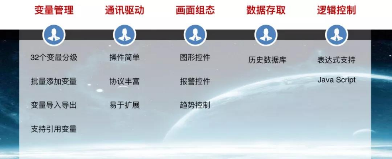 ●  開發(fā)系統(tǒng):應(yīng)用程序的集成開發(fā)環(huán)境,用于系統(tǒng)變量管理、通訊驅(qū)動、畫面組態(tài)、數(shù)據(jù)存取、邏輯控制等操作。