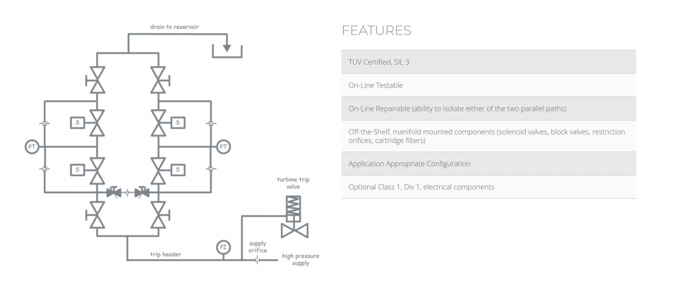 TetraSentry是一款雙并聯(lián)冗余的四閥組液壓跳閘系統(tǒng),具備在線(xiàn)測(cè)試和在線(xiàn)修復(fù)的能力,已通過(guò)TUV認(rèn)證,達(dá)到SIL3的安全等級(jí)。
